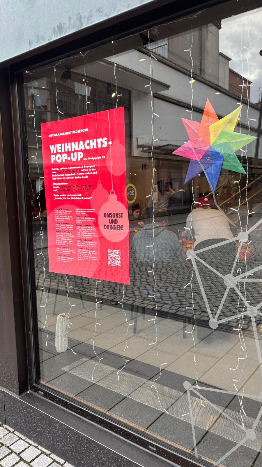 Mitten in der Paderborner Innenstadt hat das Citymanagement in der Adventszeit zum Weihnachts-Pop-up am Königsplatz 12 eingeladen und damit temporär einen Ort zum Basteln, Spielen, Entspannen und Begegnen geschaffen. Unter dem Motto „Basteln, bis das Christkind kommt“ bestand hier vom 22. November bis 20. Dezember 2025 ein gemütlicher Treffpunkt für alle, die beim Weihnachtstrubel kurz durchatmen oder kreativ werden wollten. Ergänzend dazu verwandelten sich Marktplatz und Westernstraße unter dem Motto „Oh, du Fröhliche!“ zu Bühnen, an denen in der gesamten Adventszeit stimmungsvolle Konzerte in der Paderborner Innenstadt stattfanden.