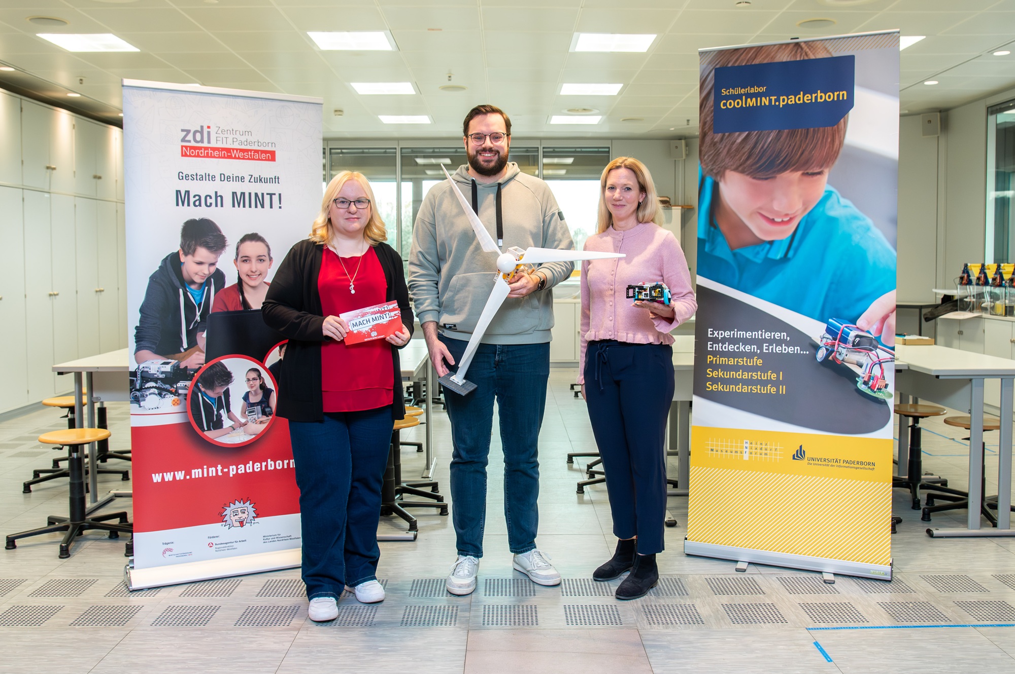 Foto (HNF/Sergei Magel): v.l. Beate Wilper, zdi.Paderborn, Tobias Blomberg, coolMINT-Schülerlabor und Dorothee Indlekofer, HNF.