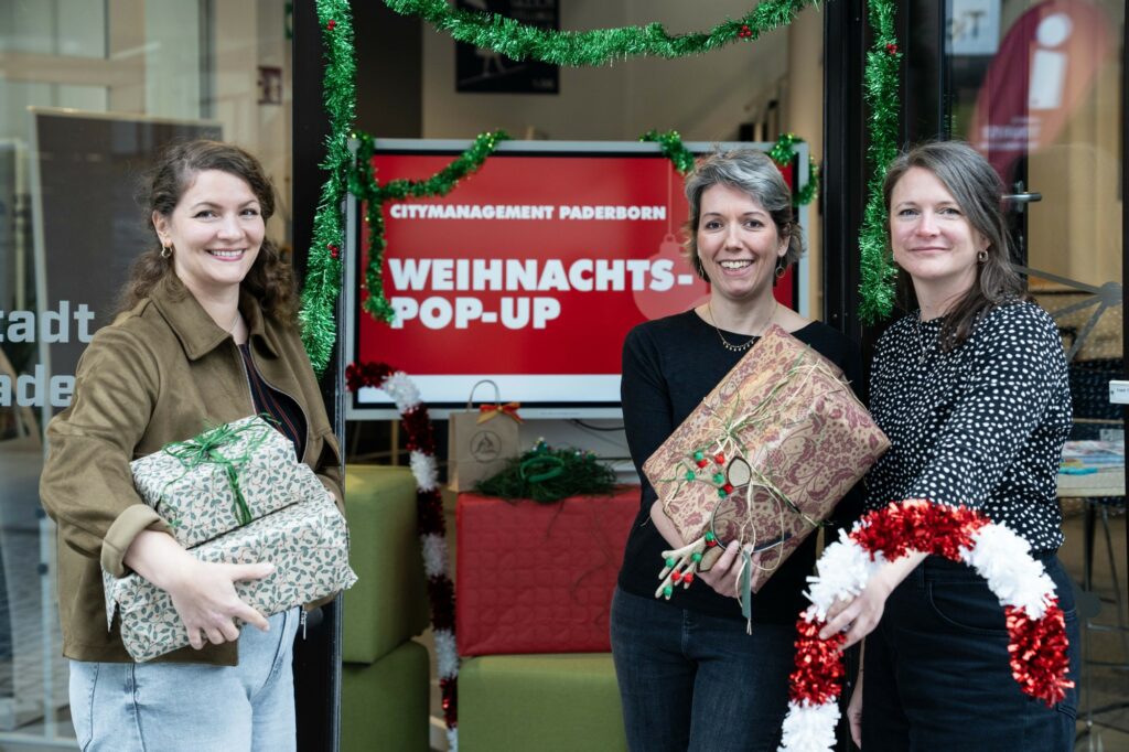 Foto (WFG/Tobias Vorwerk): v. l.: Lena Schräder, Vera Westerwinter und Verena Meise vom Citymanagement Paderborn vor dem Weihnachts-Pop-Up.