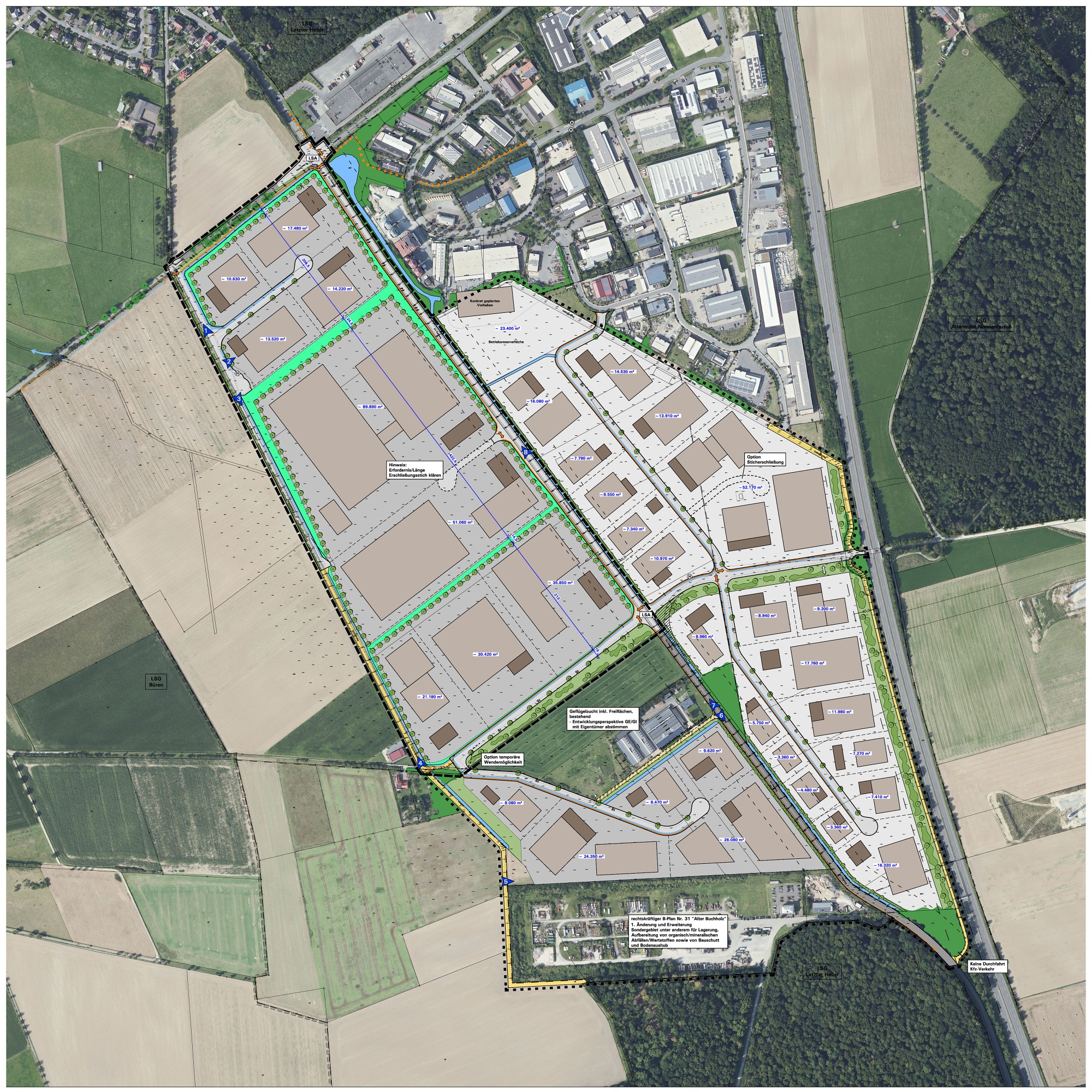 Das nördliche Plateau 1 soll für die Ansiedlung von mittelgroßen Gewerbe- und Industriebetrieben dienen. Hierzu sind vier Teilgrundstücke von 1 ha bis 1,7 ha vorgesehen. Insgesamt entstehen auf diesem Plateau 5,58 ha Gewerbefläche für die Unternehmensansiedlung. Aufgrund der Erschließung mit einer Stichstraße ist hier die Ansiedlung mehrerer Betriebe mit durchschnittlichem Flächenbedarf möglich. Das mittlere Plateau 2 mit circa 14,95 ha ist als größte zusammenhängende Fläche für die Ansiedlung von flächenintensiven Unternehmen mit großen zusammenhängenden Produktionsprozessen vorgesehen. In der Flächenplanung sind hier zwei separate Grundstücke von 5 ha und 9 ha vorgesehen. Hiermit kann auf diesem Plateau insgesamt auch den Bedürfnissen der größten Ansiedlungsvorhaben entsprochen werden. Das südliche Plateau 3 ist unmittelbar an das Verkehrsnetz angeschlossen und soll mit Teilflächen von 2,1 bis 3,5 ha an Unternehmen veräußert werden. Dabei entstehen Gewerbeflächen von circa 8,75 ha.