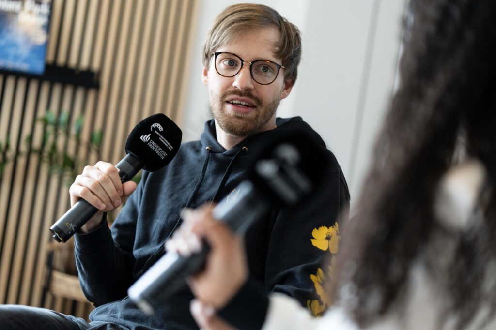 Foto (WFG/Tobias Vorwerk): Moderatorin Selina Hare im Gespräch mit IMAscore-Geschäftsführer Xaver Willebrand in den Paderborner Büroräumen des Unternehmens.